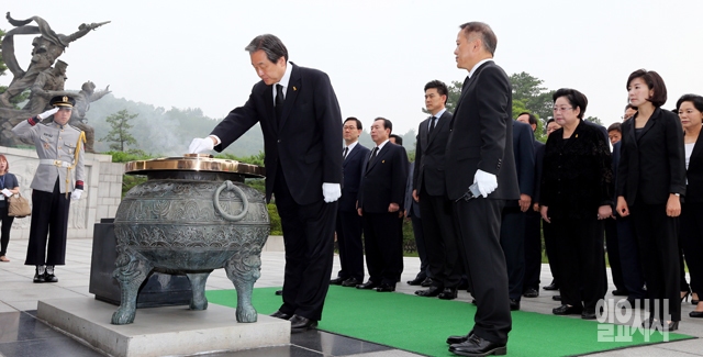 김무성 새누리당 대표와 신임 지도부가 15일 서울 동작구 국립현충원을 찾아 분향하고 있다.