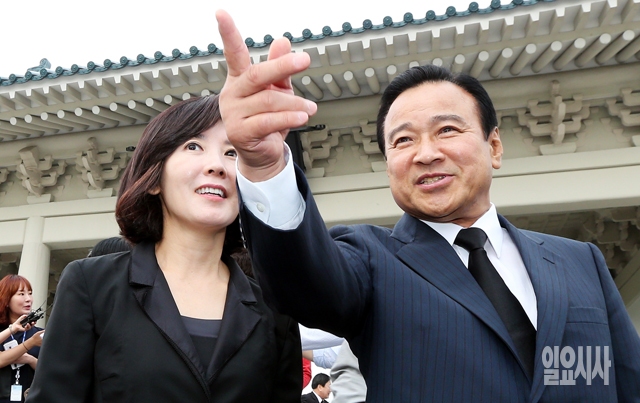 새누리당 이완구 원내대표(오른쪽)와 나경원 동작을 후보가 15일 서울 동작구 국립현충원을 찾아 참배를 마친 뒤 이야기를 나누고 있다.