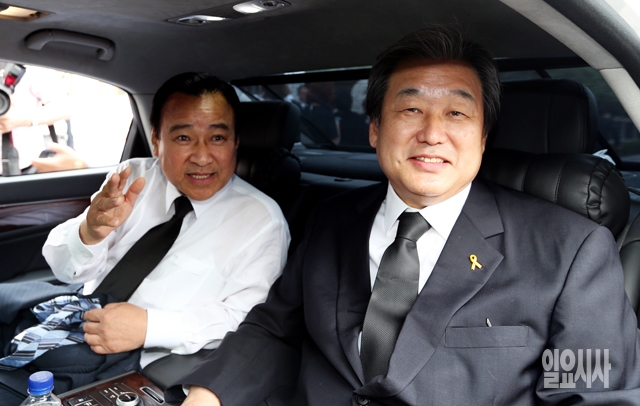 새누리당 김무성 대표(오른쪽)와 이완구 원내대표가 15일 서울 동작구 국립현충원을 찾아 참배를 마친 뒤 수원에서 열리는 최고위원회의에 참석하기 위해 차량에 탑승해 있다.