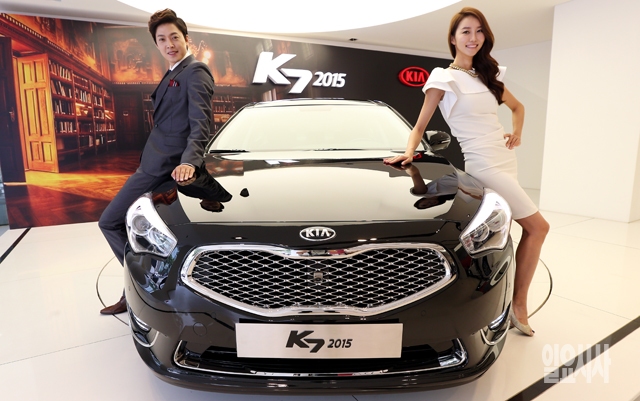 기아자동차가 15일 서울 강남구 압구정동 기아차 국내영업본부에서 프리미엄 준대형 세단 'K7 2015'를 선보이고 있다.