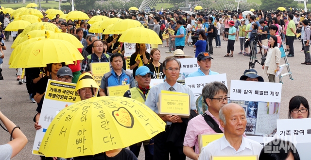 세월호 참사 국민대책회의가 15일 서울 여의도공원에서 기자회견을 마친 뒤 4·16 특별법 제정을 촉구하는 시민350만1266명의 서명이 담긴 박스를 들고 국회로 향하고 있다.