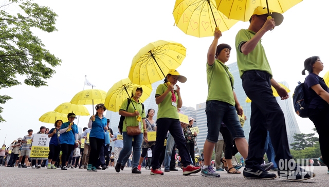 세월호 참사 국민대책회의가 15일 서울 여의도공원에서 기자회견을 마친 뒤 4·16 특별법 제정을 촉구하는 시민350만1266명의 서명이 담긴 박스를 들고 국회로 향하고 있다.