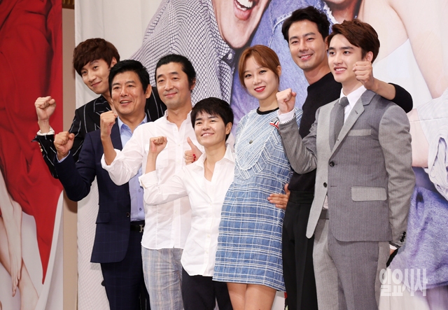 15일 서울 논현동 임페리얼팰리스 호텔에서 열린 SBS드라마스페셜 '괜찮아 사랑이야' 제작발표회에서 제작진과 출연배우들이 파이팅을 외치고 있다. 배우 이광수, 성동일, 연출 김규태, 극본 노희경, 배우 공효진, 조인성, 도경수.