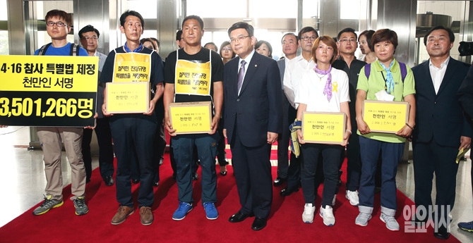 15일, 서울 여의도 국회에서 4·16 특별법 제정을 촉구하는 시민350만1266명의 서명이 담긴 416개의 박스를 국회에 전달하기 위해 세월호 참사 국민대책회의 일행이 국회 안으로 들어서고 있다.