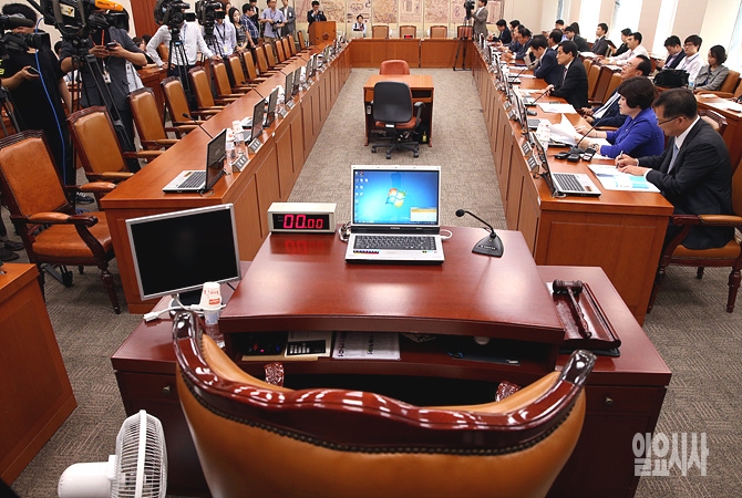 22일 오전, 새누리당의 요청으로 서울 여의도 국회 교육문화체육관광위원회 전체회의가 열린 교문위 회의실에 야당 위원들이 불참한 채 새누리당 의원들만 참석해 있다.