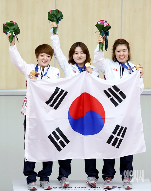 22일 인천 옥련국제사격장에서 열린 2014 인천 아시안게임 사격 여자 25m 권총 단체전 시상식에서 김장미(왼쪽부터), 이정은, 곽정혜가 금메달을 수상한 뒤 관중들의 환호에 답하고 있다.