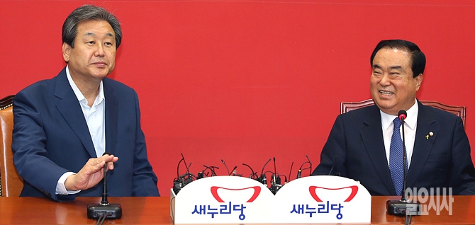 22일 오후, 새누리당 김무성 대표와 최근 비상대책위원회를 겨우 꾸린 새정치민주연합 문희상 비상대책위원장(사진 오른쪽)이 서울 여의도 국회 새누리당 당대표실에서 회동하고 있는 가운데, 문 비대위원장이 활짝 웃음 짓고 있다.