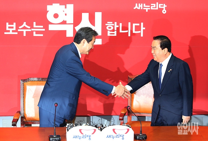 22일 오후, 새누리당 김무성 대표(사진 왼쪽)와 새정치민주연합 문희상 비상대책위원장이 서울 여의도 국회 새누리당 당대표실에서 회동 직전, 악수하고 있다.