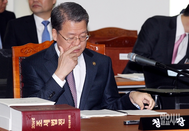 임환수 국세청장이 8일 서울 수송동 국세청에서 열린 국회 기획재정위원회의 국정감사에서 코를 만지고 있다.