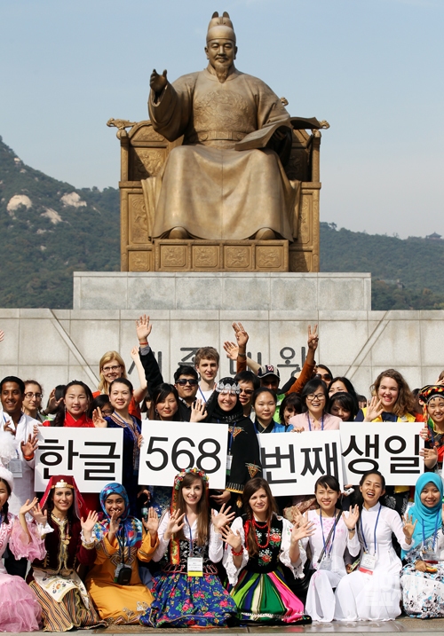 한글날을 하루 앞둔 8일 서울 광화문광장 세종대왕 동상 앞에서 전세계 세종학당에서 한국어를 공부하는 외국인들이 각기 자국의 전통 의상을 입고 한글 창제 기념 퍼포먼스를 선보이고 있다.