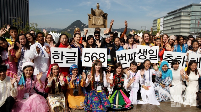한글날을 하루 앞둔 8일 서울 광화문광장 세종대왕 동상 앞에서 전세계 세종학당에서 한국어를 공부하는 외국인들이 각기 자국의 전통 의상을 입고 한글 창제 기념 퍼포먼스를 선보이고 있다.
