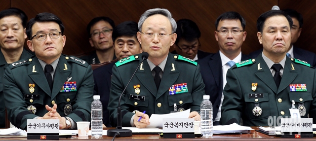 황우웅 국군복지단장(가운데)이 8일 서울 용산 국방부에서 열린 국회 국방위원회의 국정감사에서 의원들의 질의에 답하고 있다.