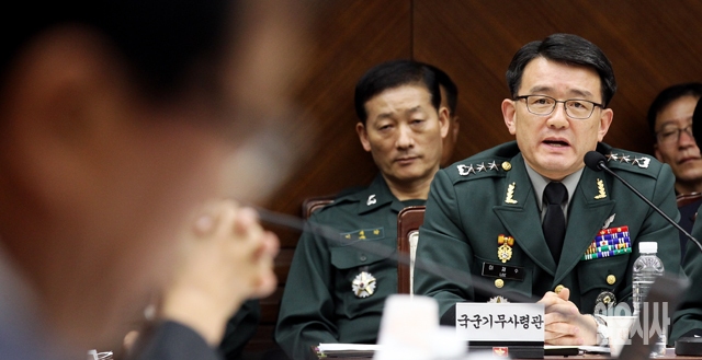 이재수 국군기무사령관이 8일 서울 용산 국방부에서 열린 국회 국방위원회의 국정감사에서 의원들의 질의에 답하고 있다.