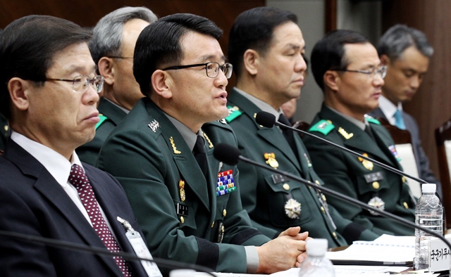 이재수 국군기무사령관(왼쪽에서 두번째)이 8일 서울 용산 국방부에서 열린 국회 국방위원회의 국정감사에서 의원들의 질의에 답하고 있다.