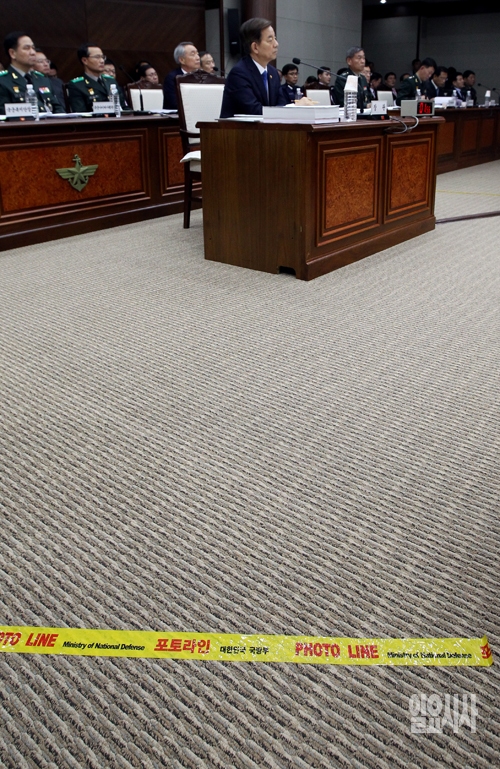 8일 서울 용산 국방부에서 국회 국방위원회의 국정감사가 열리고 있는 가운데 한민구 국방부 장관 주변에 포토라인이 그어져 있다.