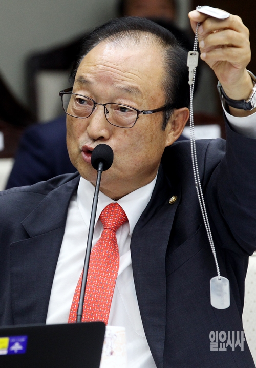 새누리당 송영근 의원이 8일 서울 용산 국방부에서 열린 국회 국방위원회의 국정감사에서 군번줄을 들어보이며 질의하고 있다.