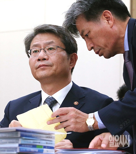 8일, 서울 여의도 국회 외교통일위원회 회의실에서 열린 통일부에 대한 국정감사에 류길재 통일부장관이 출석한 가운데, 한 통일부 관계자가 추가자료를 제시하고 있다.