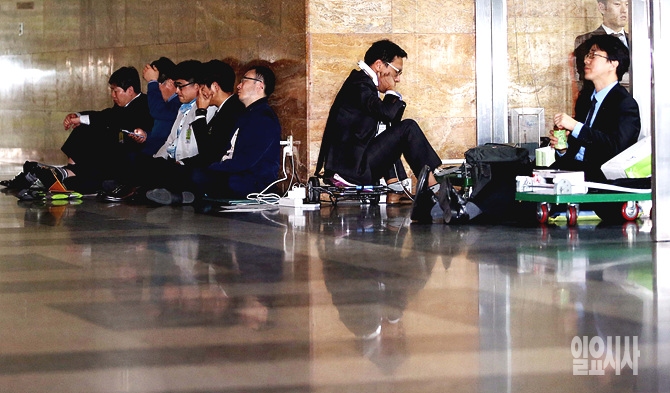8일, 서울 여의도 국회의 한 상임위원회 앞 대기실 옆 바닥에 피감기관 관계자들이 주저앉아 피곤한 듯 눈을 붙이고 있다.