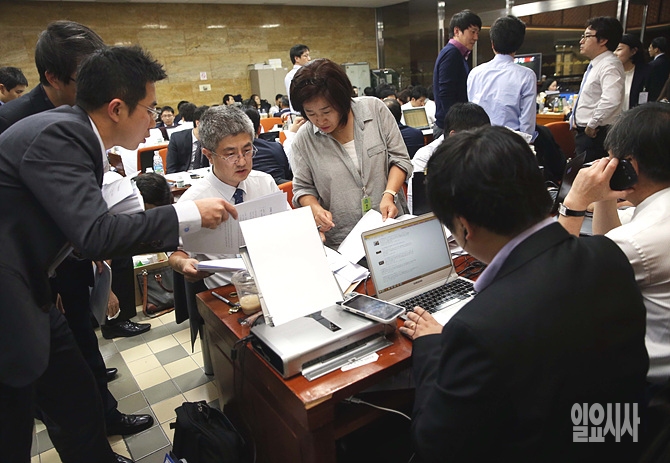8일, 서울 여의도 국회의 한 상임위원회 앞 대기실에 피감기관 관계자들이 국감 관련 뉴스를 체크하면서 자료를 확인하고 있다.