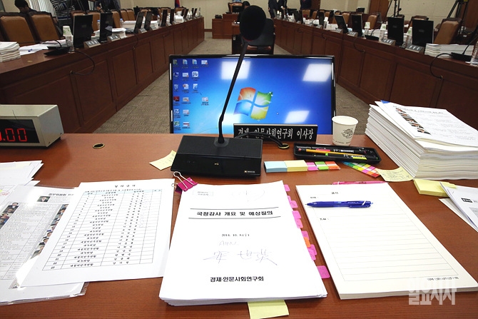 8일 오후 서울 여의도 국회 정무위원회 회의실에서 열린 경제·인문사회연구회 등에 대한 2014 국정감사 도중 여야 간 증인 협상 문제로 인해 잠시 정회가 선언됐다.