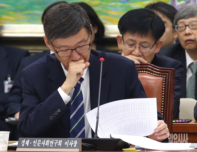 8일, 서울 여의도 국회 정무위원회 회의실에서 열린 경제·인문사회연구회 등에 대한 2014 국정감사에서 안세영 경제·인문사회연구회 이사장이 잠시 답변자료를 확인하고 있다.