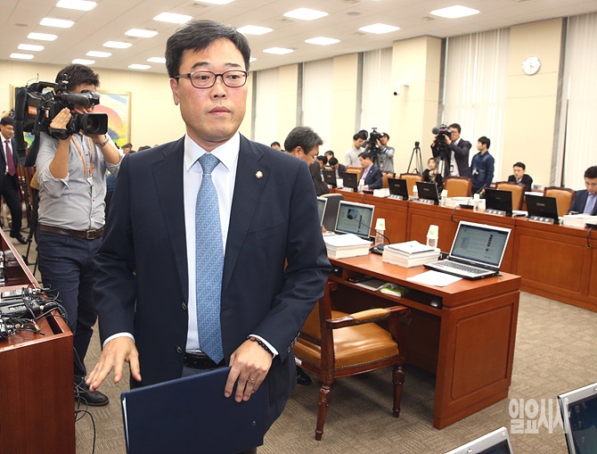 8일, 서울 여의도 국회 정무위원회 회의실에서 열린 경제·인문사회연구회 등에 대한 2014 국정감사에서 증인 채택 문제로 잠시 정회가 선언되자, 김기식 야당 간사가 회의장을 빠져 나가고 있다.