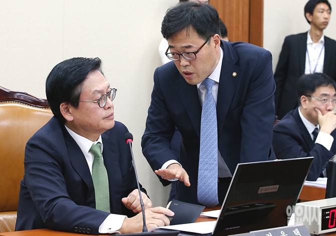 8일, 서울 여의도 국회 정무위원회 회의실에서 열린 경제·인문사회연구회 등에 대한 2014 국정감사에서 정우택 정무위원장(사진 왼쪽)과 김기식 야당 간사가 잠시 이야기를 나누고 있다.