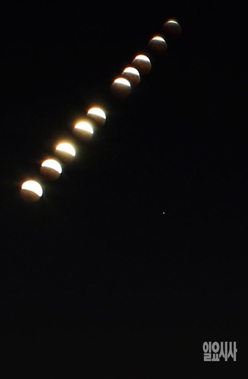 8일 저녁 달이 지구 그림자에 정면으로 가려지는 개기월식이 펼쳐지고 있다. 지난 2011년 이후 3년 만이다. 사진 10장 레이어 합성.
