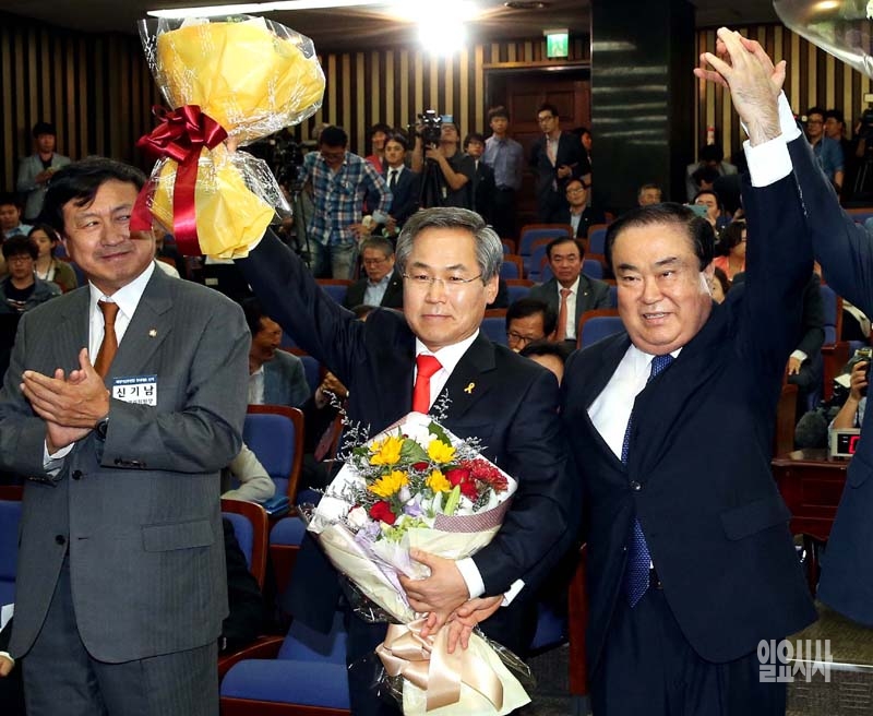 새정치민주연합 원내대표 보궐선거를 위한 의원총회가 열린 9일 오후 서울 여의도 국회 246호실에서 문희상비대위원장이 원내대표에 선출된 우윤근 의원과  인사를 하고 있다