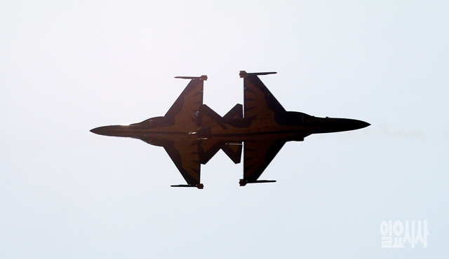 10일 경기도 수원공군기지에서 열린 '공군과 함께하는 2014경기항공전'에서 공군 특수비행팀 '블랙이글'이 에어쇼를 선보이고 있다.