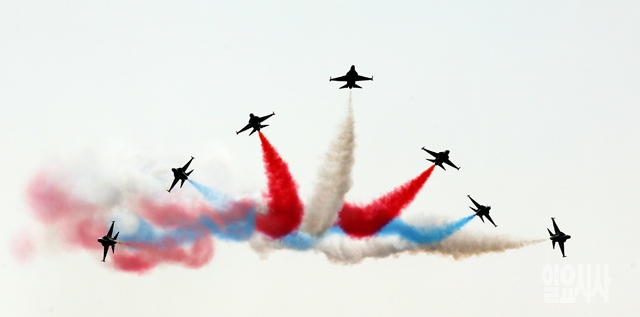 10일 경기도 수원공군기지에서 열린 '공군과 함께하는 2014경기항공전'에서 공군 특수비행팀 '블랙이글'이 에어쇼를 선보이고 있다.