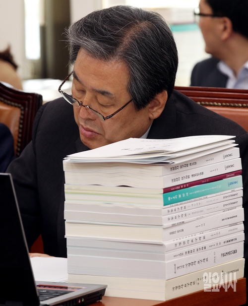 김무성 새누리당 대표가 10일 서울 여의도 국회에서 열린 농림축산식품해양수산위원회의 국정감사에 참석해 자료를 검토하고 있다.