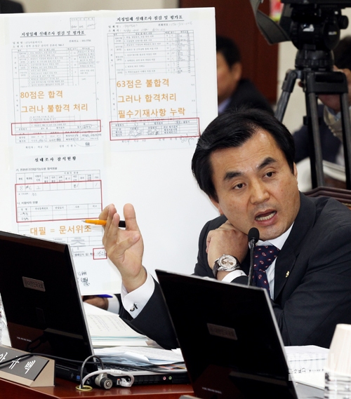 새정치민주연합 안규백 의원이 10일 서울 여의도 국회에서 열린 국방위원회의 병무청 국정감사에서 박창명 병무청장에게 질의를 하고 있다.