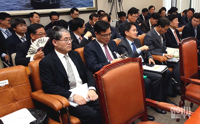 13일, 서울 여의도 국회 산업자원통상부 회의실에서 열린 2014 산자부 국정감사가 열린 가운데, 피감기관 관계자들이 대기하고 있다.
