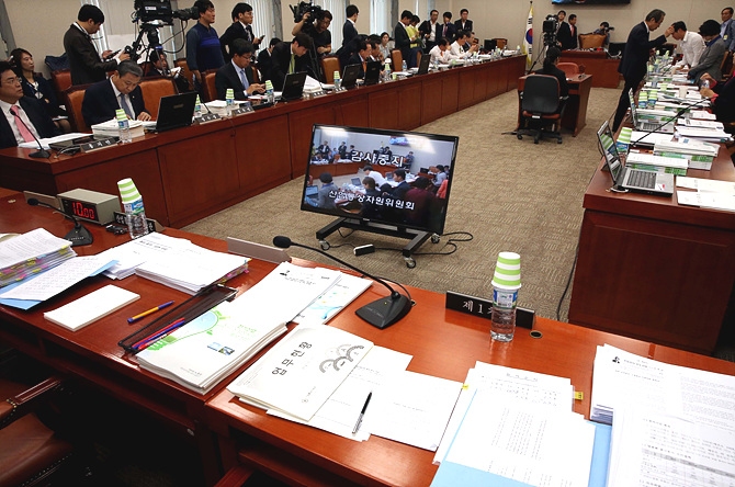 13일, 서울 여의도 국회 산업자원통상부 회의실에서 열린 2014 산자부 국정감사 도중 사전 검열 문제가 논란으로 번지며 잠시 감사가 중지돼 있다.