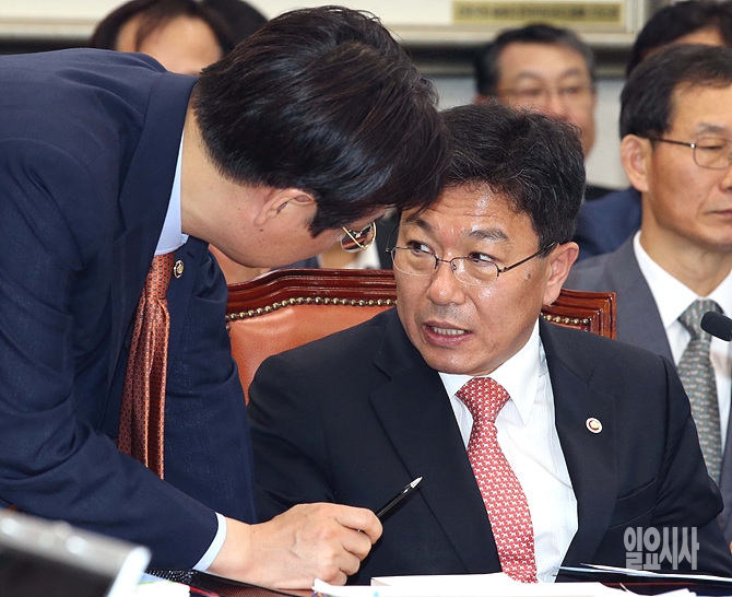 13일, 서울 여의도 국회 산업자원통상부 회의실에서 열린 2014 산자부 국정감사에서 윤상직 장관이 관계자와 잠시 이야기를 나누고 있다.