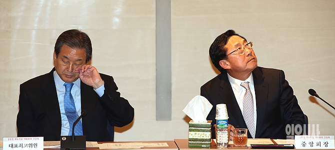 4일, 서울 여의도 중소기업중앙회에서 새누리당 김무성 대표, 주호영 정책위의장 등 지도부와 김기문 중소기업중앙회장 등 중소기업 인사들이 참석한 가운데 '새누리당과 함께하는 중소기업·소상공인 현장이야기' 간담회 도중 김 대표와 김기문 중소기업중앙회장이 다른 포즈를 하고 있다.