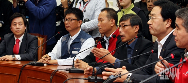 공무원연금개혁 관련 공무원투쟁본부 지도부들이 7일 서울 여의도 국회 새누리당 대표실에서 김무성 대표와의 면담을 갖고 발언을 하고 있다.