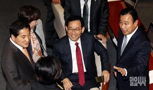 7일 서울 여의도 국회에서 열린 본회의에서 새누리당 이완구 원내대표(맨 오른쪽)을 비롯한 의원들이 이야기를 나누고 있다.