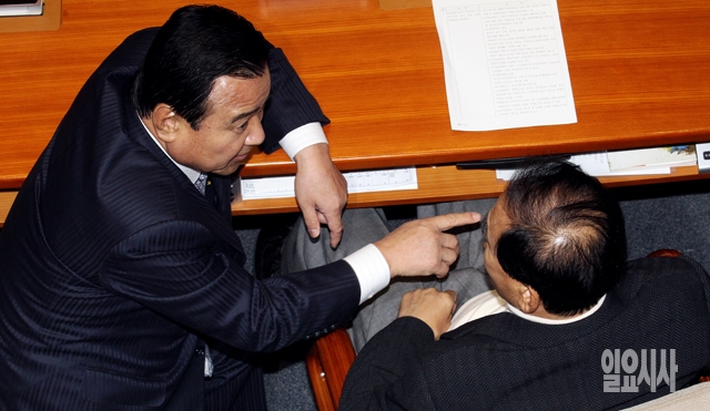 새누리당 이완구 원내대표(왼쪽)와 이재오 의원이 7일 서울 여의도 국회에서 열린 본회의에서 대화하고 있다.