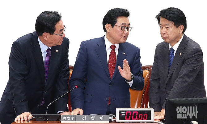 전병헌 국민안전혁신특위 위원장(사진 가운데)이 17일, 서울 여의도 국회에서 열린 안전행정위 국민안전혁신특별위원회 첫 회의 직전, 김태원(사진 왼쪽)·노웅래 여야 간사가 이야기를 나누고 있다.