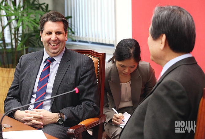 16일, 서울 여의도 국회 새누리당 당 대표실에서 마크 리버트 미국 대사가 김무성 대표의 예방을 받은 자리에서 대화 도중 웃음 짓고 있다.