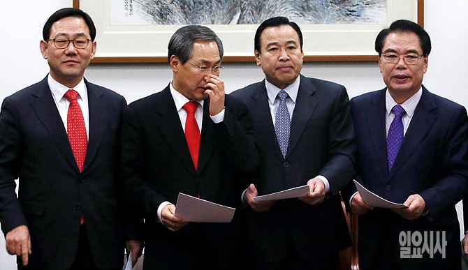 23일, 서울 여의도 국회에서 열린 여야주례회동에서 이완구-우윤균 여야 원내대표, 주호영-백재현 여야 정책위의장 등이 회동 결과를 발표하기 위해 한 자리에 서 있다.