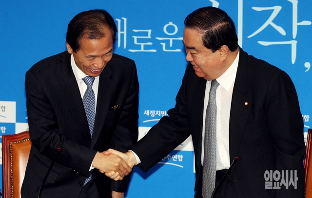 새정치민주연합 문희상 비상대책위원장(오른쪽)과 최문순 강원도지사가 14일 서울 여의도 국회에서 열린 비상대책위원회의에서 악수하고 있다.