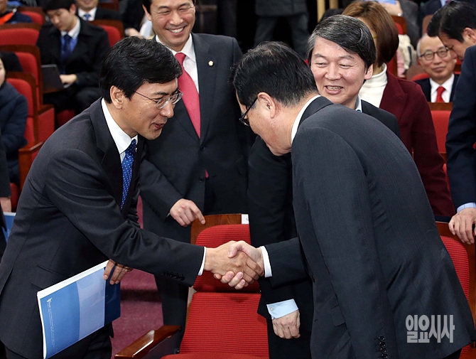 11일, 서울 여의도 국회 의원회관에서 열린 '더미래연구소 창립식 및 창립기념 토론회'에서 정의화 국회의장과 안희정 충남도지사가 악수를 나누고 있다.
