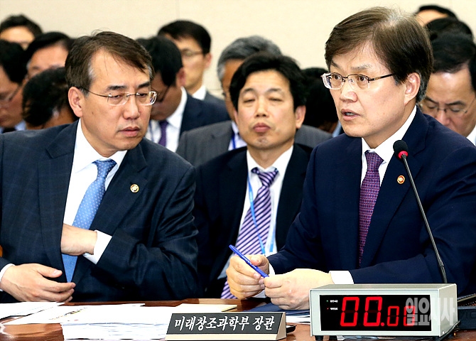 27일, 서울 여의도 국회 미래창조과학방송통신위원회 회의실에서 열린 미방위 전체회의에서 최양희 미래창조과학부장관(사진 왼쪽)이 의원들의 질의에 답변하고 있다.