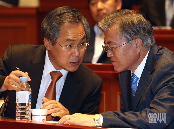6일, 서울 여의도 국회에서 새정치민주연합 의원총회가 열린 가운데, 문재인 대표(사진 오른쪽)과 우윤근 원내대표가 '공무원연금개혁안'과 관련해 논의하고 있다.