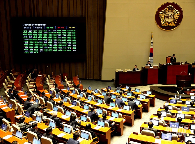 12일 서울 여의도 국회에서 열린 본회의에서 누리과정 예산을 지원하기 위한 지방채 발행을 골자로 하는 '지방재정법'이 재석 244명, 찬성 202명, 반대 13명, 기권 29명으로 본회의를 통과하고 있다.