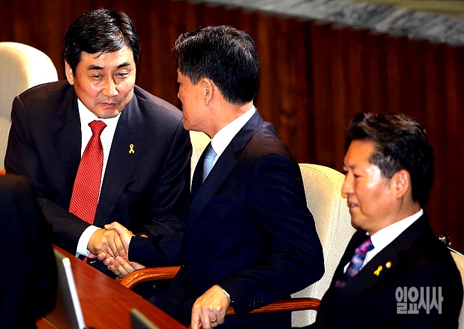 12일 서울 여의도 국회에서 열린 본회의 직전, 새정치민주연합 이종걸 원내대표와 주승용 최고위원이 악수를 나누고 있다.