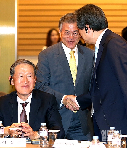 21일, 서울 여의도 전경련회관에서 열린 게르하르트 슈뢰더 독일 전 총리와의 특별 대담 직전 새누리당 김무성 대표(사진 오른쪽)가 새정치민주연합 문재인 대표(사진 가운데)와 악수를 나누고 있다.